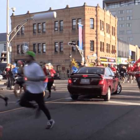 Frau fährt mit Auto auf Marathon-Strecke